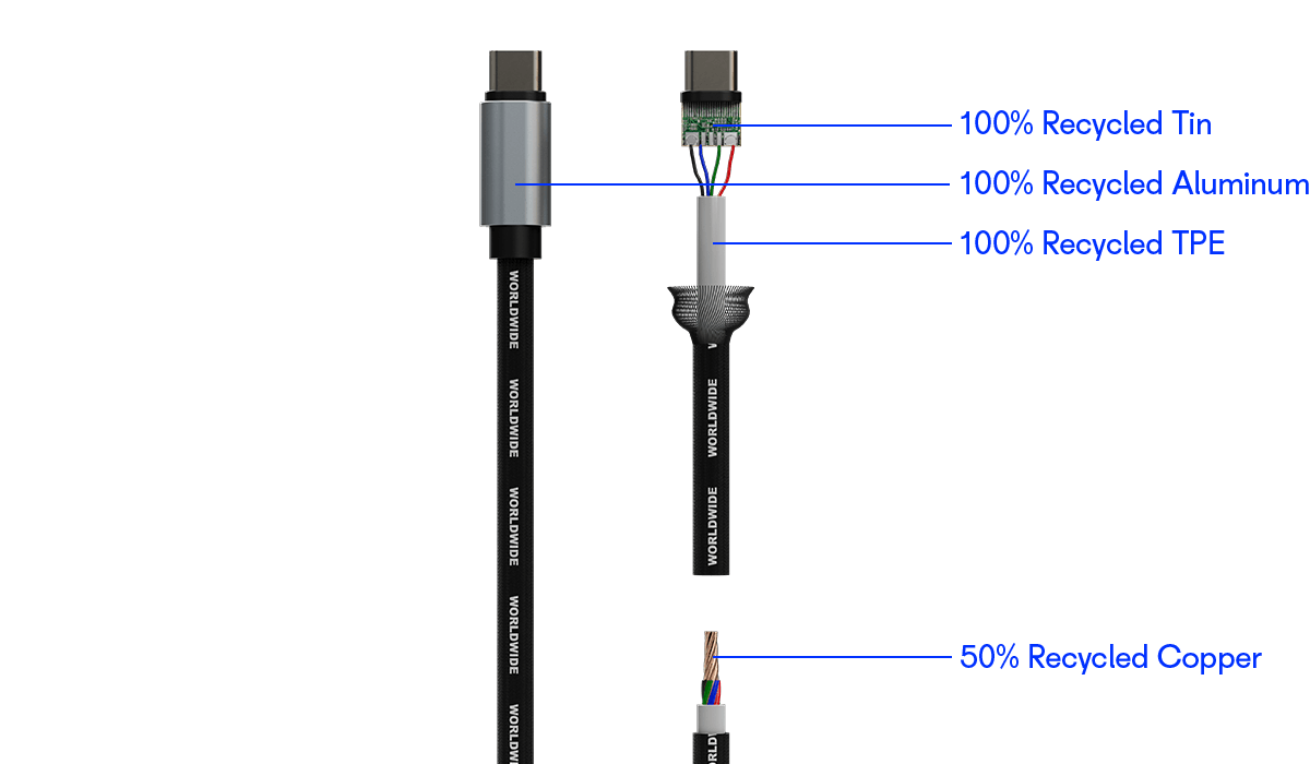 - Features: Fast Charging functionality with a maximum power of up to 60W. The internal cables are made from sustainable materials: 100% recycled tin, 100% recycled TPE, 100% recycled aluminum, 50% recycled copper.